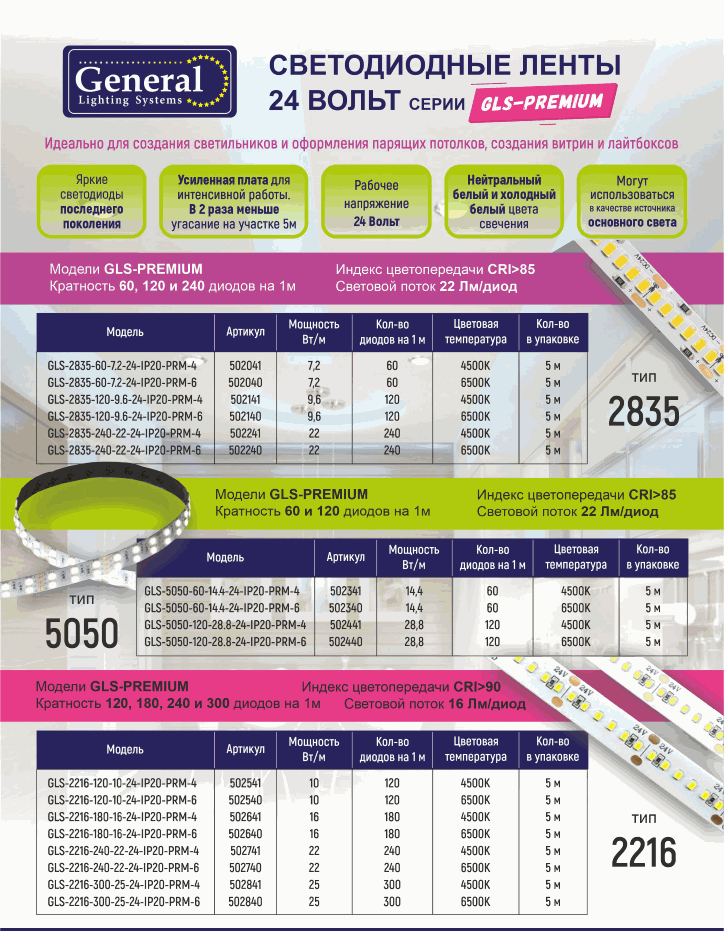 Профессиональные ленты GLS-Premium с напряжением 24 Вольта оснащены высокоэффективными светодиодами с повышенным световым потоком, высоким индексом цветопередачи (CRI>85 для моделей 2835 и 5050, CRI>90 для моделей 2216) и созданы для решения дизайнерских задач, производства светильников и осветительных конструкций. Гарантия 3 года